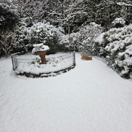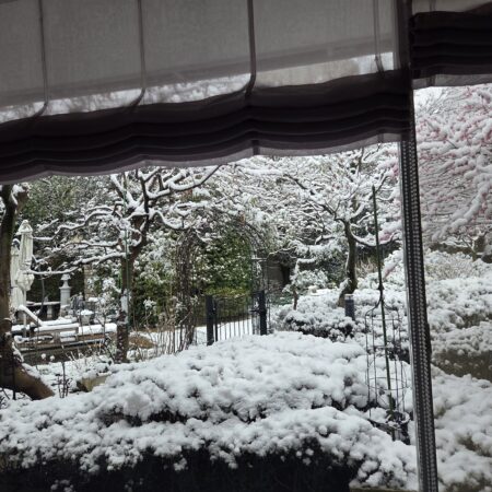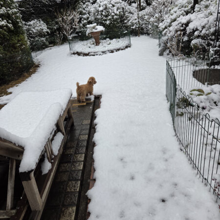 早朝、寒~い、、、、外は思いがけず雪景色。