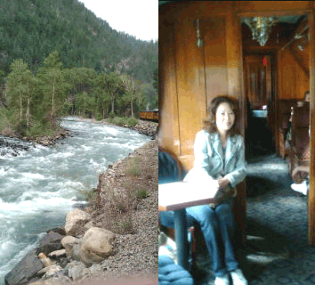 急流にかなりの登り坂を感じる時、鉄道開発が盛んに競われた、ゴールドラッシュの頃の中国系労働者の苦労が 思われる。途中で二回ほど円錐型のタンクから給水するのだが、そのたびに汽関車の後に消防の為について来る小さな点検車が追いつき手を振ってご挨拶!実に陽気だ!三時間半のシュッシュッポッポの旅でスキー場で有名な小さな町、シルバートンに到着。