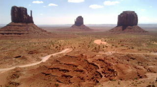 7月17日。大昔は海底だったと言うダイナミックな断層に囲まれた道を通り抜けるとやがてモニュメントバレーの最も有名な3つのメサが現れ、ジョンウエインの映画「駅馬車」で一台の駅馬車と護衛の騎兵隊の列がここを通り抜けた西部の雄大な荒野のシーン、まさにその情景そのもの。